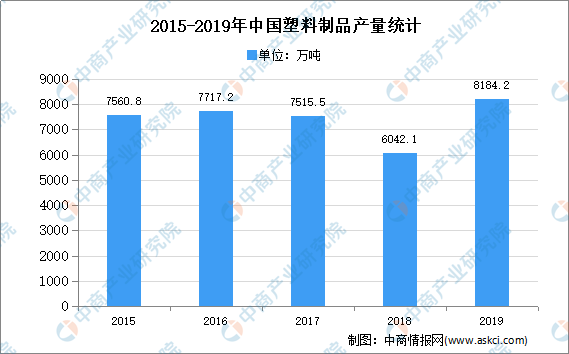 塑料是高分子化合物加入适当填料和其他添加剂,经加工成型的塑性材料或固化交联形成的刚性材料。树脂的本色大都是白色半透明或无色透明的,需要根据制品的应用要求进行着色处理,以起到色别标识、美观的作用。数据显示,中国塑料制品产量由2011年的5474.4万吨增长至2019年的8184.2万吨,年均复合增长率为5.2%。