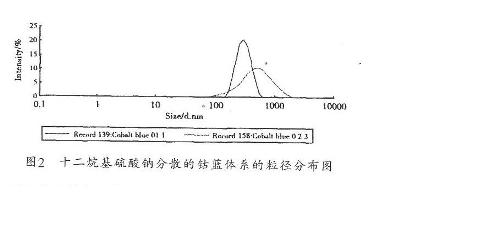 从钴蓝悬浮液经不同分散剂后沉降测量结果得出十二烷基硫酸钠的分散效果较差,分散剂KH550,KH560和A-842的分散效果较好。使用十二烷基硫酸钠分散剂的钴蓝颗粒表面吸附的分散剂较少,钴蓝粒子周围有一定的团聚现象,使其粒径变大,其粒度分布如图2中Record158所示,稳定性较差。